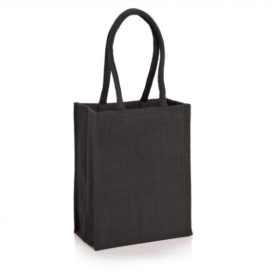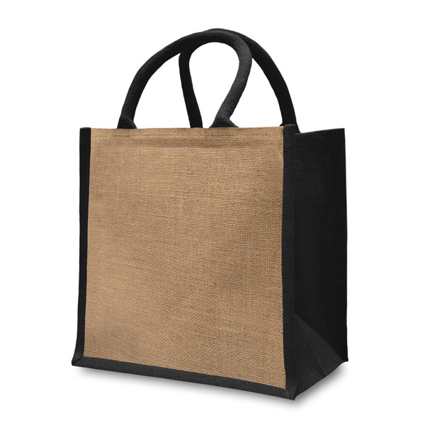 DESCRIPTION: Shopping carrier bag with cotton padded handle in black dyed jute.