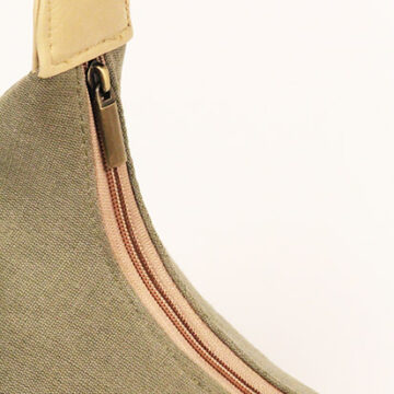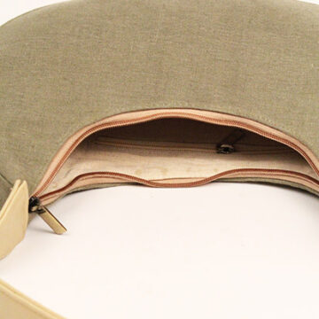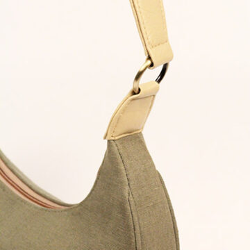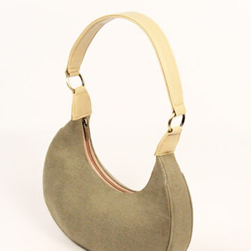 Moon baguette in olive green. Material – Juco, with brass hardware. Faux leather handles.