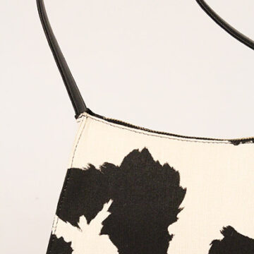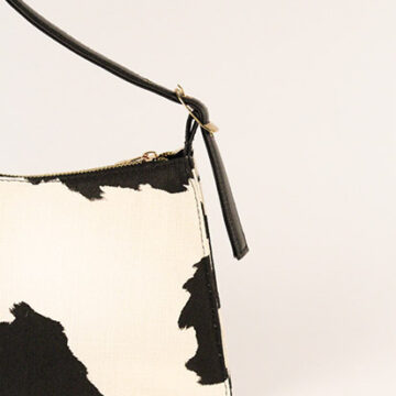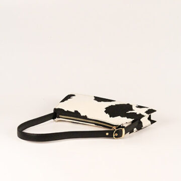 Jute Smart’s iconic classic monochrome cow printed shoulder bag. This unique shaped bag comes with adjustable faux leather straps by 3 knots, cotton lining inside with an inner pocket.