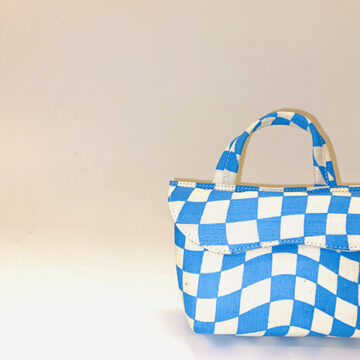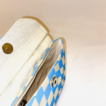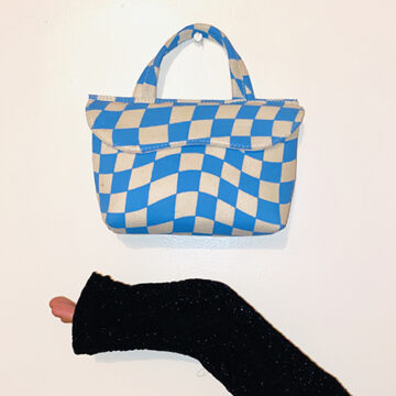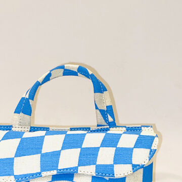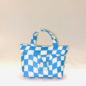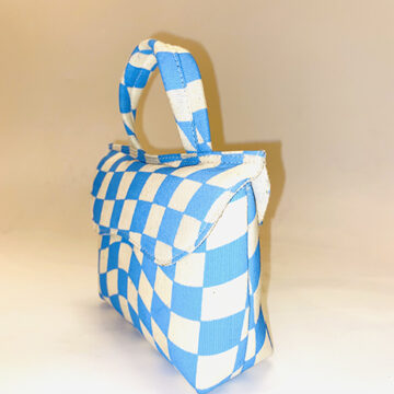 Chic blue and white checkered printed mini depicting the character CASSIE – can also be carried and styled as belt pouch.