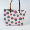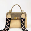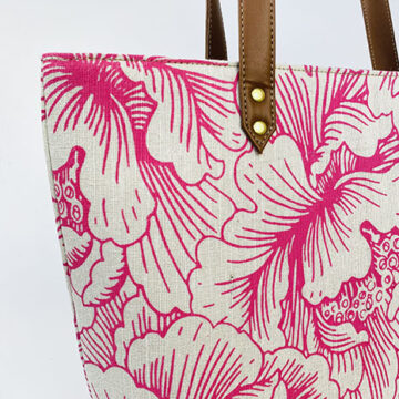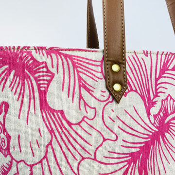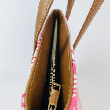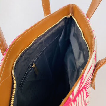 It’s jute/cotton base with printed on top and faux leather studded straps with zipper on the opening.