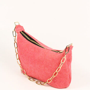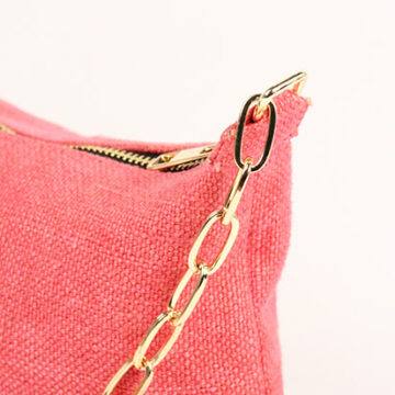 Elegant and classy and the bag is made out of jute with big gold chain as it’s strap handles and gold zipper.