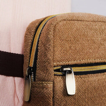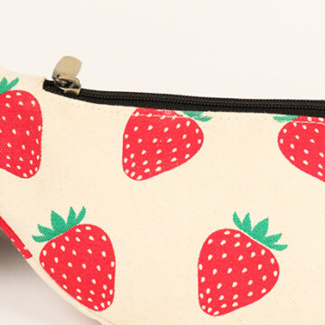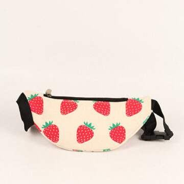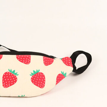 Strawberry printed fanny, with 2 compartments. Main compartment is in the front, one large compartment is in the back.