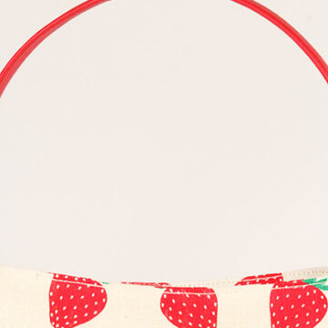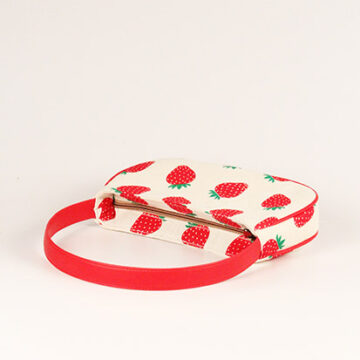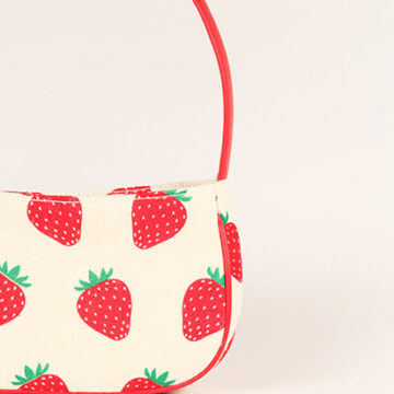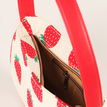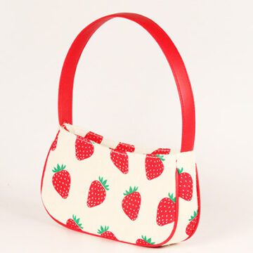 Chic strawberry printed shoulder bag with bright red faux leather strap.
