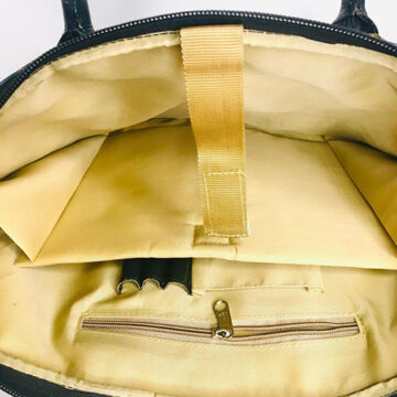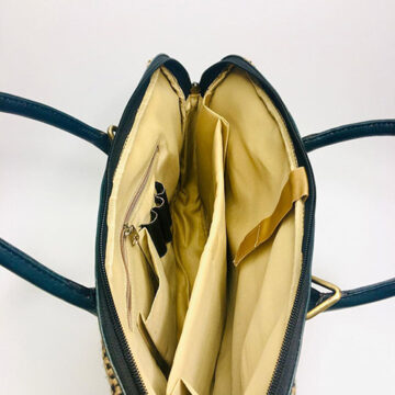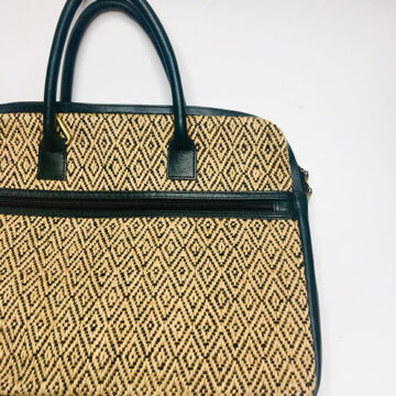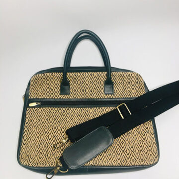 “Will easily accommodate a 15” laptop, super spacious and super sturdy, handicraft jute body, with front pocket, adjustable detachable strap, well padded inside, multiple pockets inside.”