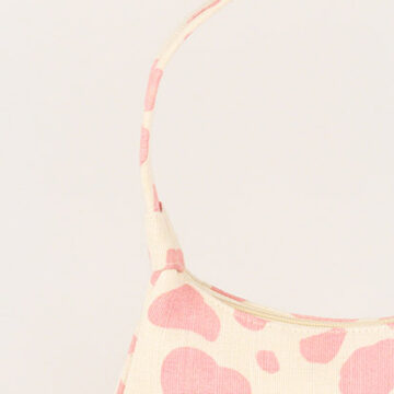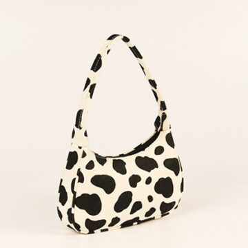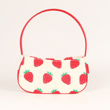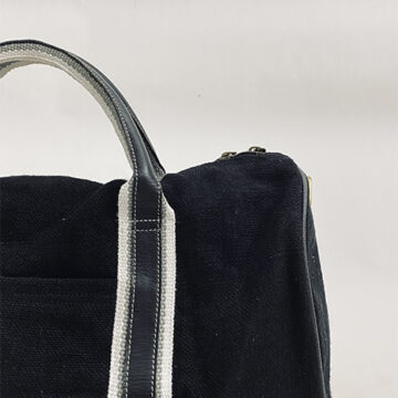 It’s jute/cotton base with printed on top and faux leather studded straps with zipper on the opening.