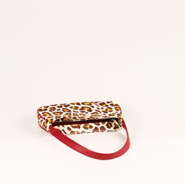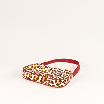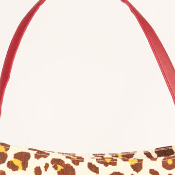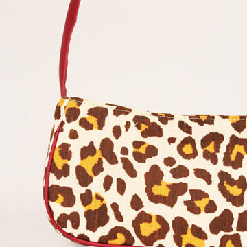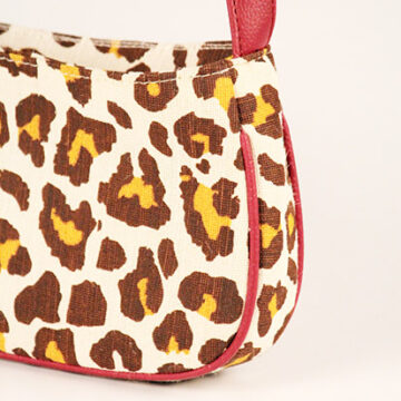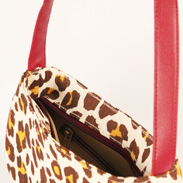 Brown with yellow printed jute leopard printed shoulder bag with cherry wine faux leather handle