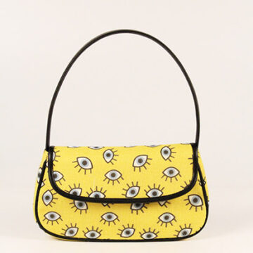 It’s jute/cotton base with printed on top and faux leather studded straps with zipper on the opening.