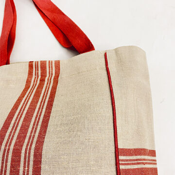 It’s jute/cotton base with printed on top and faux leather studded straps with zipper on the opening.