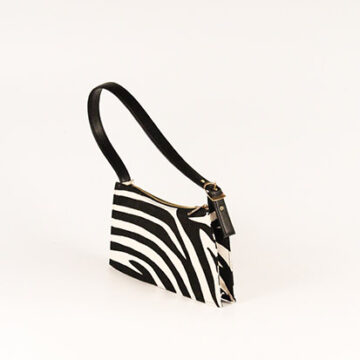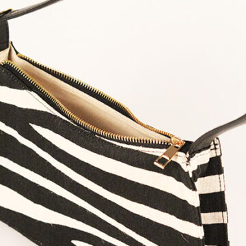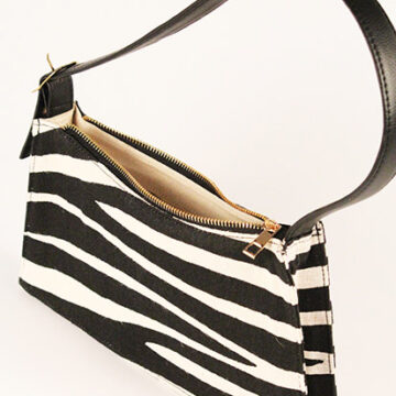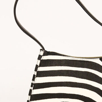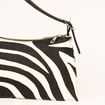 Jute Smart’s iconic classic monochrome horizontal zebra printed shoulder bag. This unique shaped bag comes with adjustable faux leather straps by 3 knots, cotton lining inside with an inner pocket.